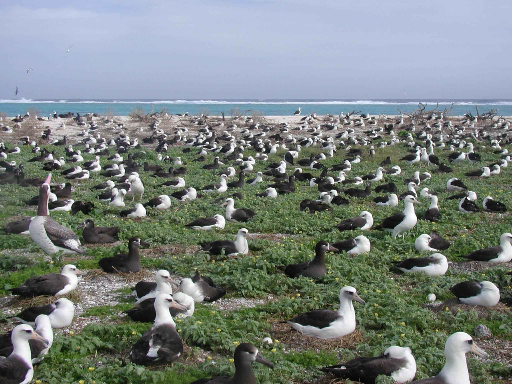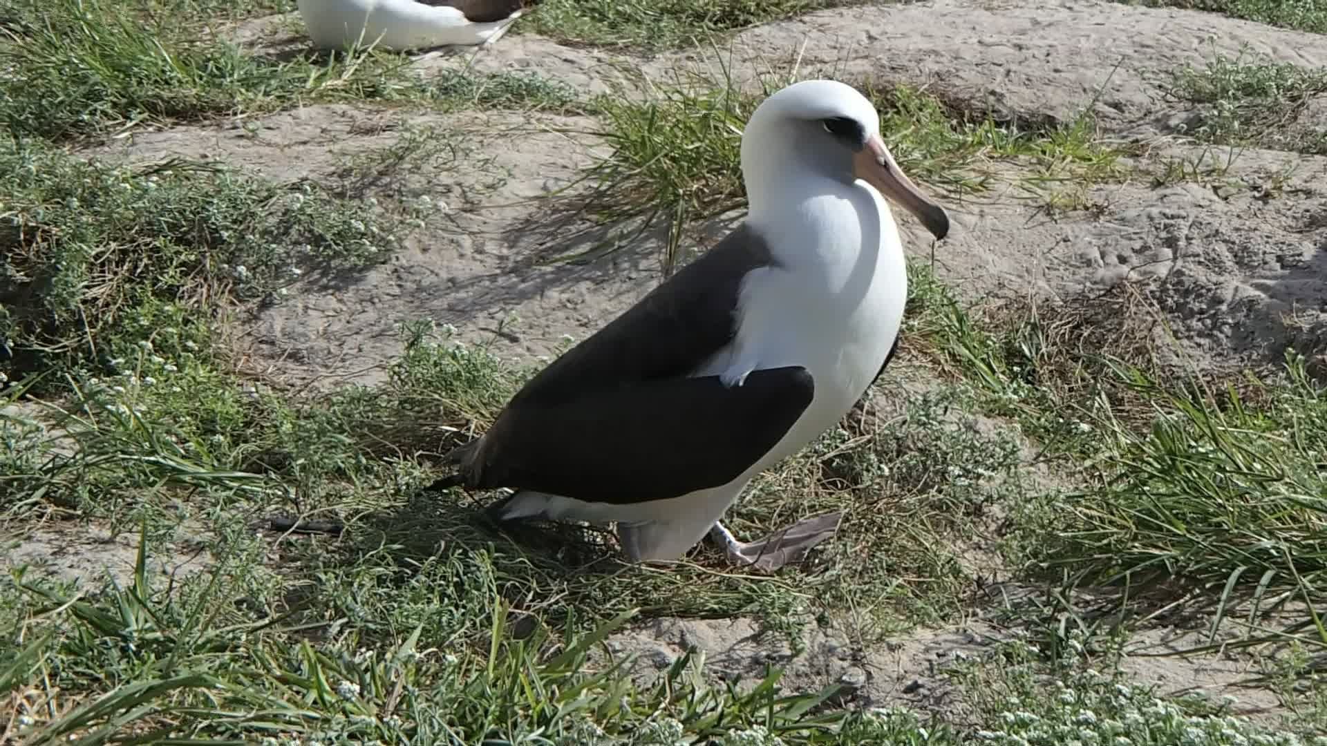 中途島是海洋動物的棲息地,每年有無數的信天翁在此繁衍後代。信天翁在沒有風的日子通常不太想飛,牠們大都待在地面上。等到風起了才展翅飛翔。