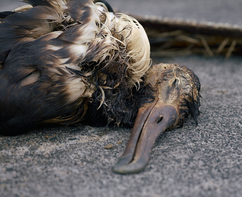 雖然中途島距離最近的工廠有數千公里之遠,可是島上卻佈滿塑膠垃圾與信天翁幼鳥的屍體。成鳥們到處找尋食物,希望能餵飽嗷嗷待哺孩子。不過牠們帶回來餵給幼鳥的竟是打火機、瓶蓋、浮標、塑膠袋和牙刷之類的垃圾。結果,導致這些幼鳥孩子們滿肚子都是塑膠垃圾,直到死於脫水、飢餓或胃穿孔等。