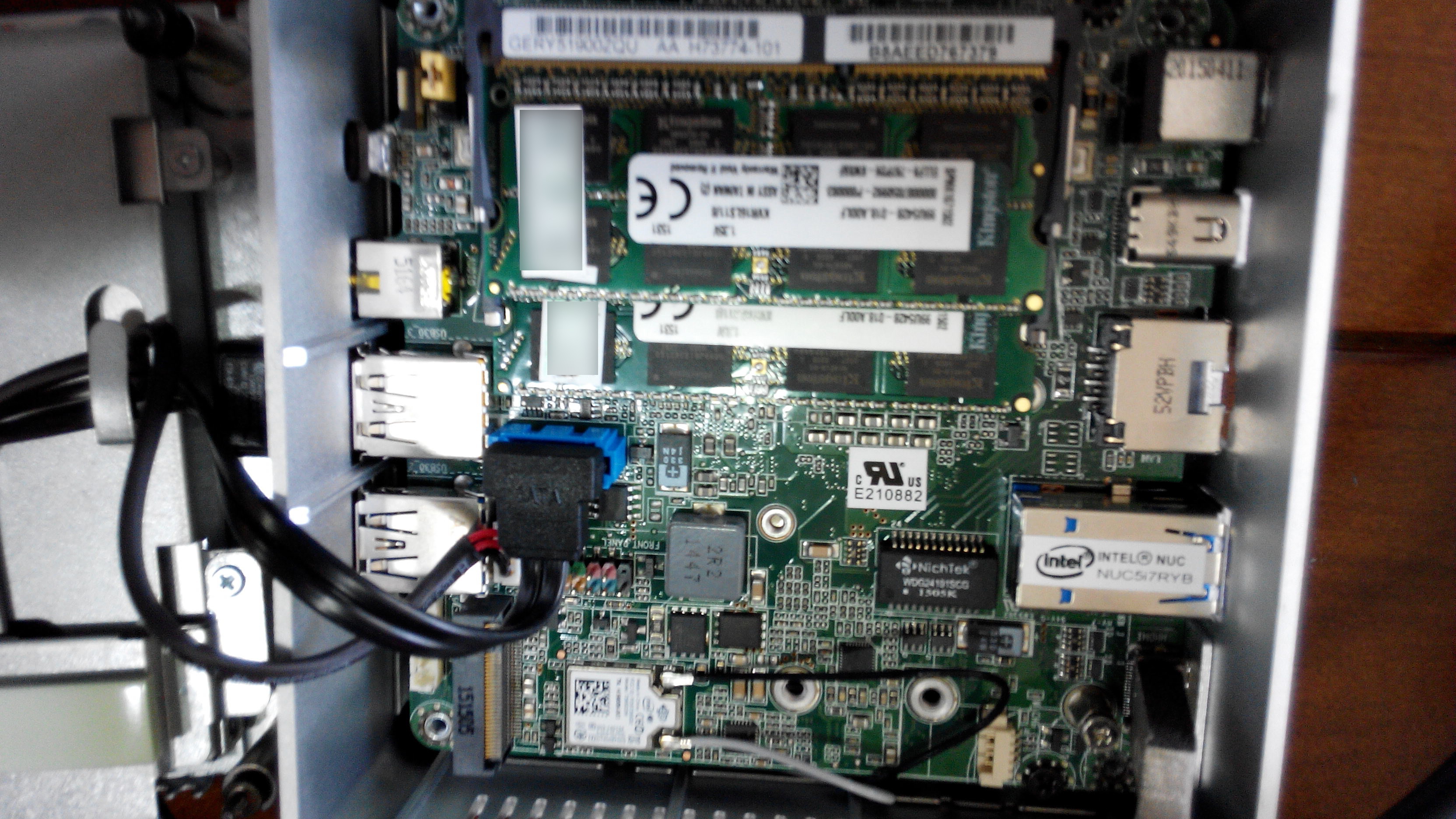 內裝,可以安插兩條低電壓記憶體,裝了16GB記憶體。一個M.2 SSD固態硬碟,我裝了128GB金士頓硬碟。