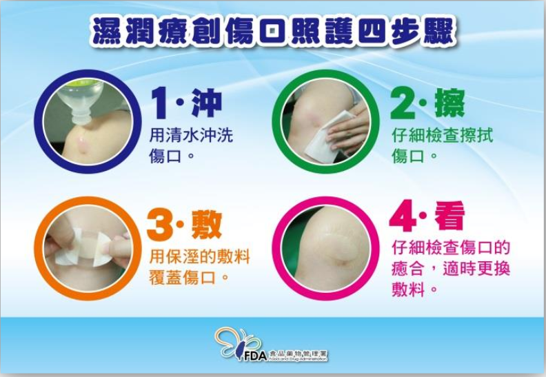傷口可依【沖、擦、敷、看】四步驟進行。