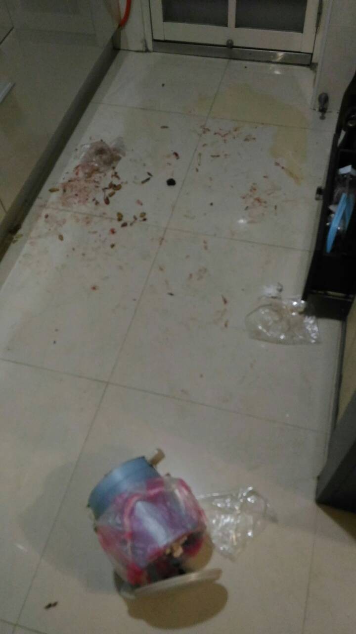 隔天週一,我們都上班上學去了。荳荳控制不了自己愛吃的嘴,竟然又自己把垃圾桶打翻,咬破垃圾袋將雞骨頭吃得一乾二淨。老婆傍晚六點多回家後,發現慘案,立即line給我家裡滿目瘡痍,遍地屎尿嘔吐的照片。