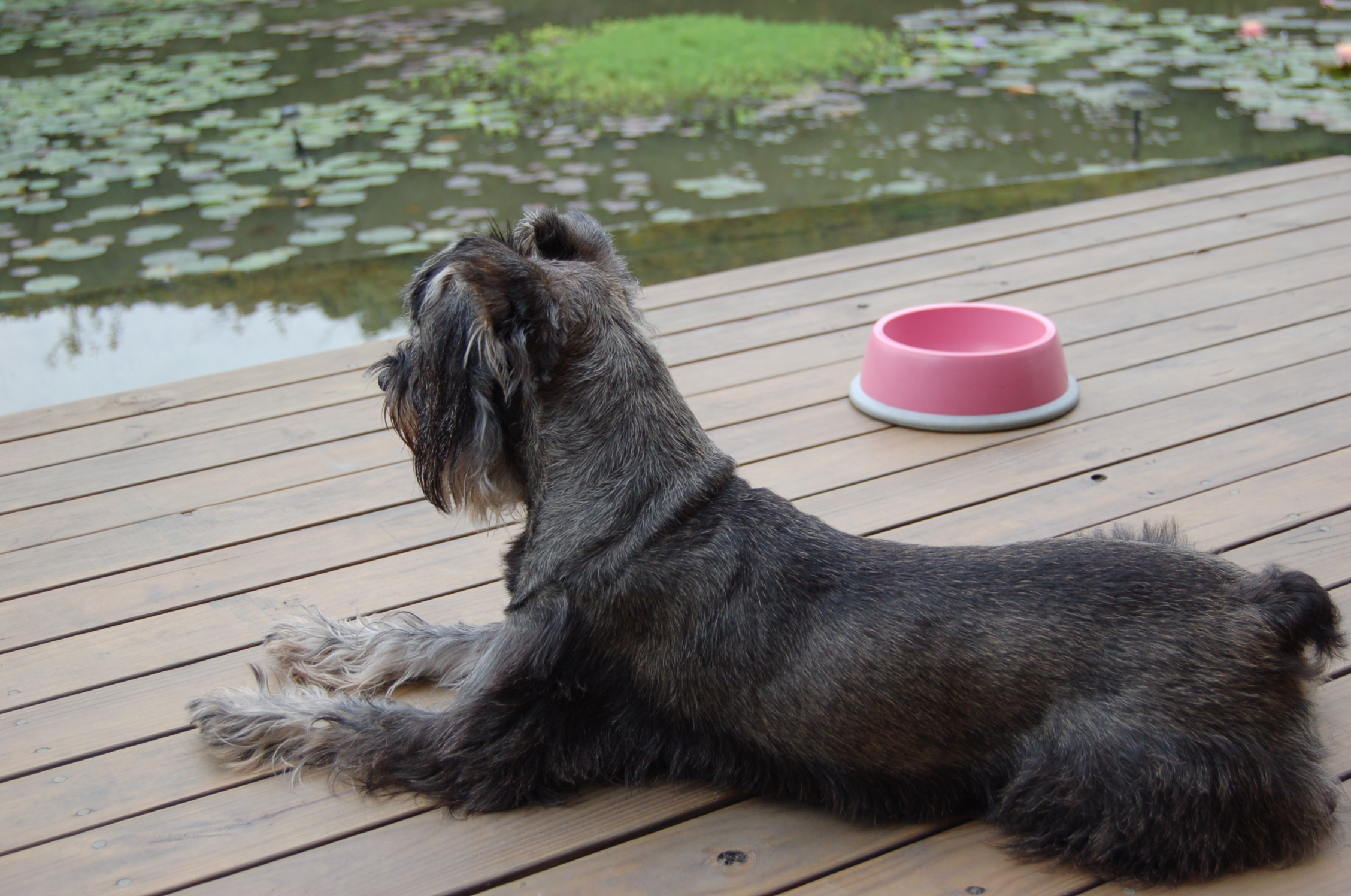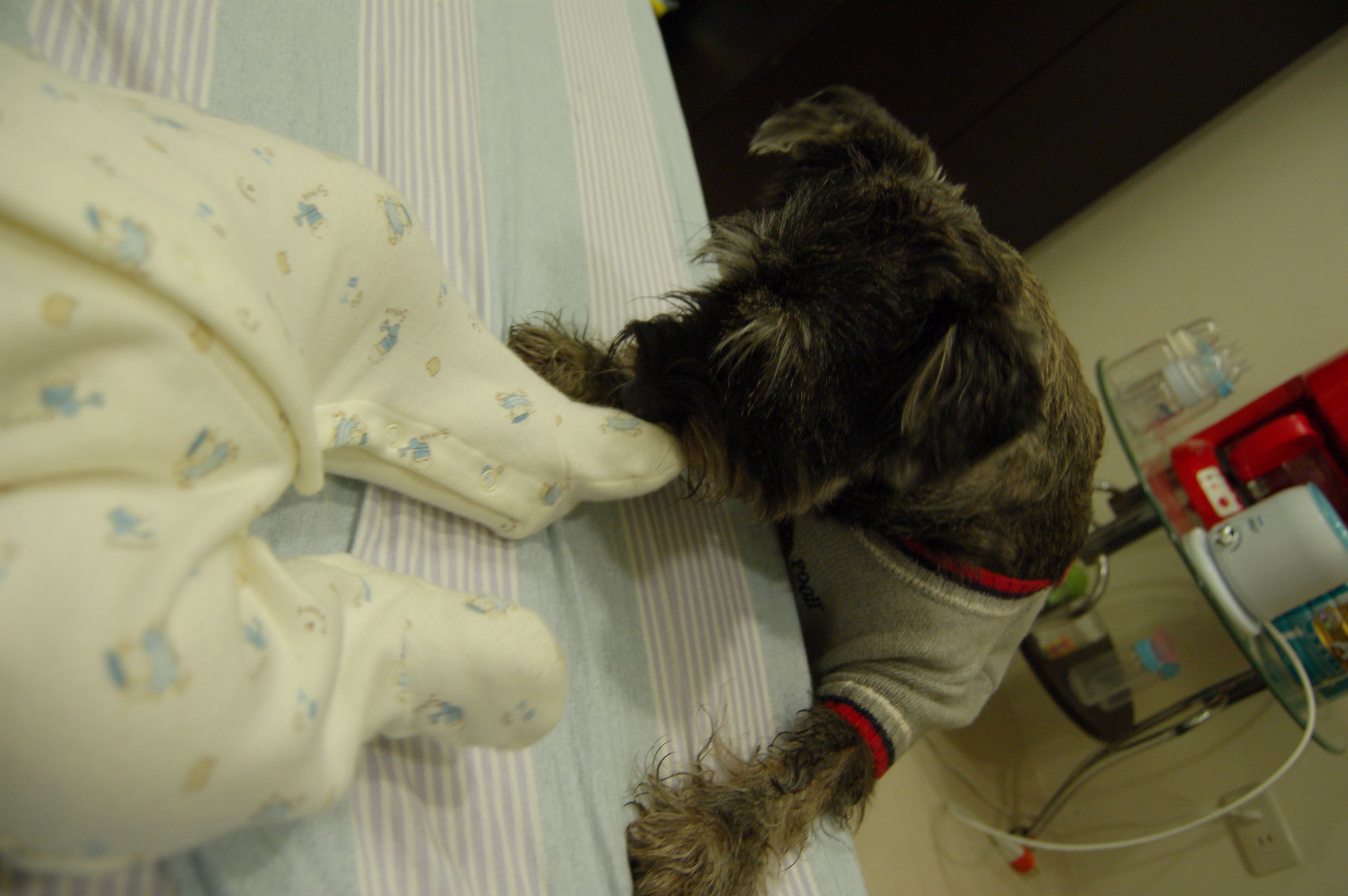 某天動物醫院的醫師說看這隻狗的腳應該不是迷你的。簡直晴天霹靂,我們突然覺得有點受騙,且不知道荳荳成犬後會長多大。立刻打電話教訓了寵物店老闆,並限制要求他三天內將血統證明寄給我,否則有他好看,竟敢騙我。幾天後,收到血統證明,是迷你雪納瑞,真是荒唐,即便收到血統證明也不能代表什麼,因為知道這些都可以造假。