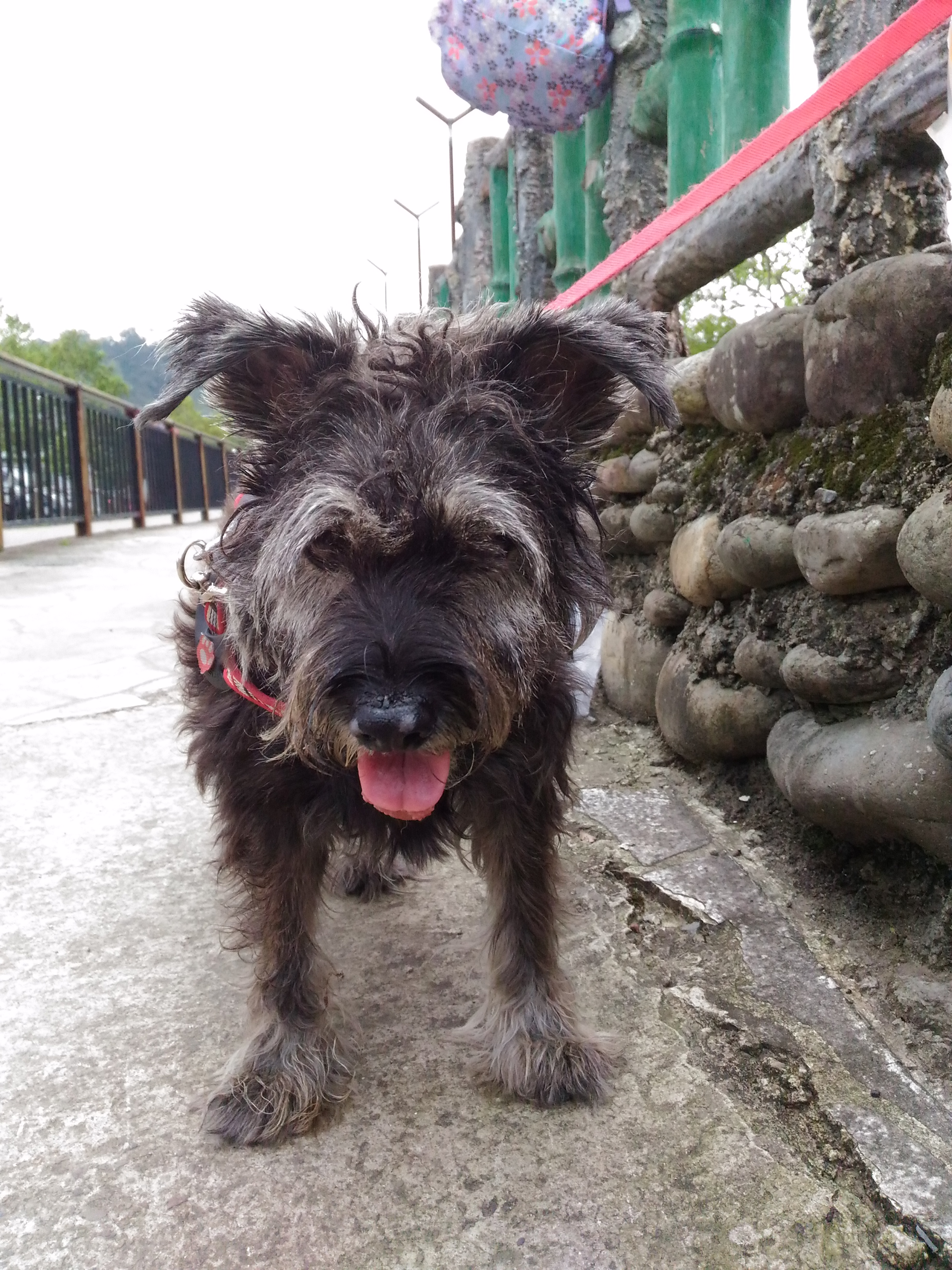 2016年3月27日(日),我們從桃園出發,和弟弟一家人約好在龍潭三坑碰面。這照片是和荳荳在人行道旁等他們逛老街時所拍攝的。她這兩年體力愈來愈差,上下樓梯也不太輕鬆了。去爬個山回來就要躺個兩天才能恢復體力,只能帶她到比較平緩好走的路面走走。